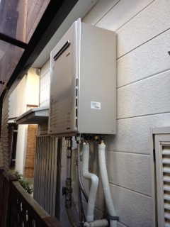 風呂給湯器からエコジョーズタイプえの取替え工事でした。現場は隣の御宅との幅60cmぐらいの狭所作業でした。