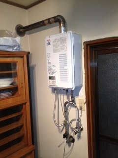 既存給湯器:大阪ガス不明10号 取替機種:リンナイRUX-V1611SWFA-E 排気筒が給湯器に向かって下り勾配だったので、取り付け位置を少し上げました。(わかりにくいですが