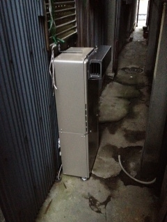室内から家の裏へのガス給湯器の取替え工事でした。 ガス栓、給水、給湯、追い焚き菅をフレキ工事で外側に移設しました。 エコジョーズ壁掛けタイプの据え置き設置です。 路地なので側方排気カバーを施工しました。 既存:ノ-リツGT-162AW 現在:リンナイRUF-E1611SAW