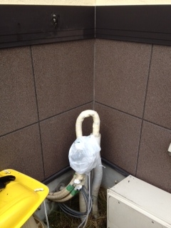 家の裏での取替え工事でした。リンナイ24号暖房機能付きエコジョーズタイプへの取替えでした。 排水工事も同時施工しました。 既存:不明 現在:リンナイRVD-E2401SAW