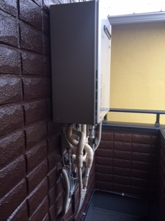 2階ベランダでの取替え工事でした。リンナイ24号追い焚き機能付き給湯器エコジョーズタイプへの取替えでした。 排水配管工事も同時施工しました。 既存:リンナイRUF-V2401SAW 現在:リンナイRUF-E2401AW