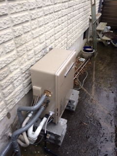 家の裏での取替え工事でした。リンナイ24号追い焚き機能付き給湯器据置型エコジョーズタイプへの取替えでした。