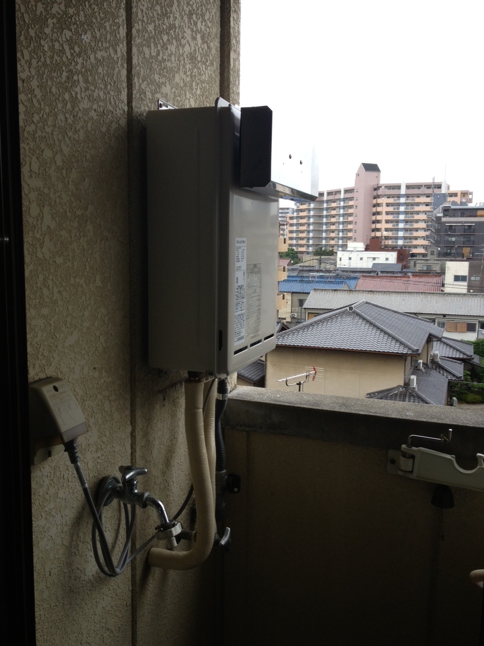 2Fにある浴室の壁から外に向けて穴をあけリモコン線を5mほど、引っ張りました!その際配線をパイプの中に通して、線が長持ちするように取り付けました!