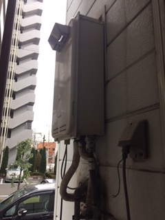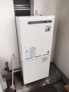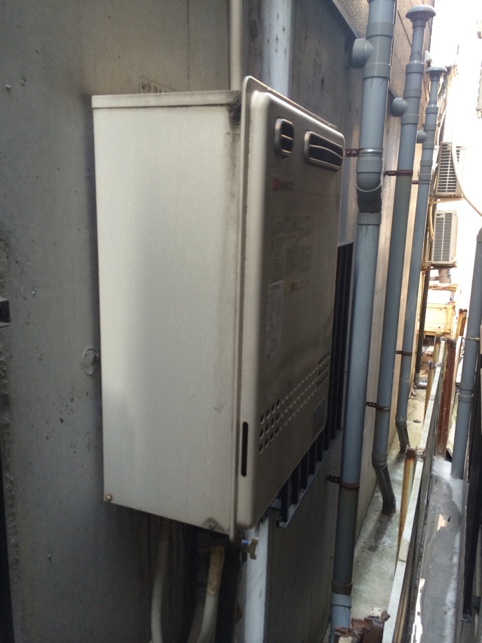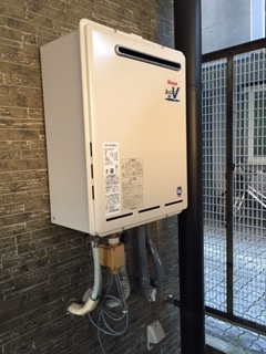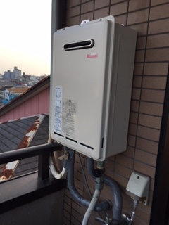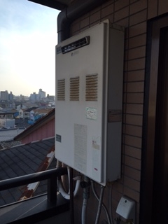 ベランダでの取替え工事でした。リンナイ16号追い焚き機能付き給湯器への取替え工事でした。